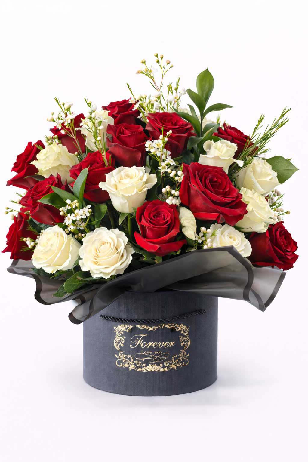 Premium: 24 stems, full luxury bouquet with eucalyptus.