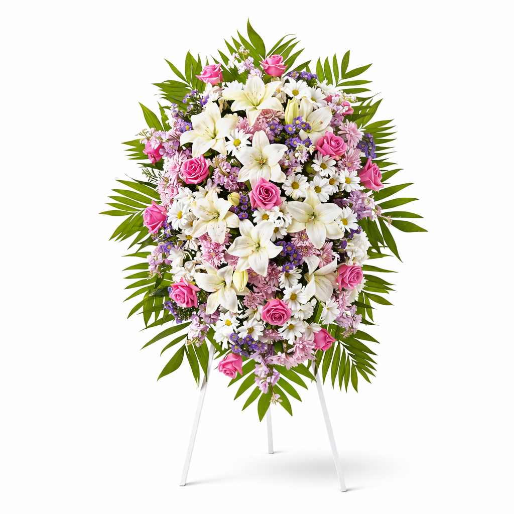 A refined standing spray featuring elegant seasonal flowers arranged with grace and serenity, offering comfort during moments of remembrance.