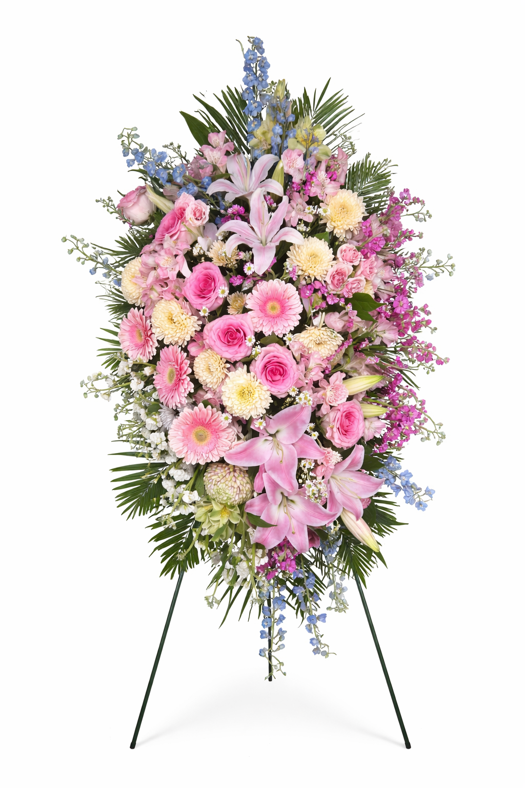 A sophisticated sympathy tribute designed with delicate blooms and flowing greenery, honoring memories that remain forever.