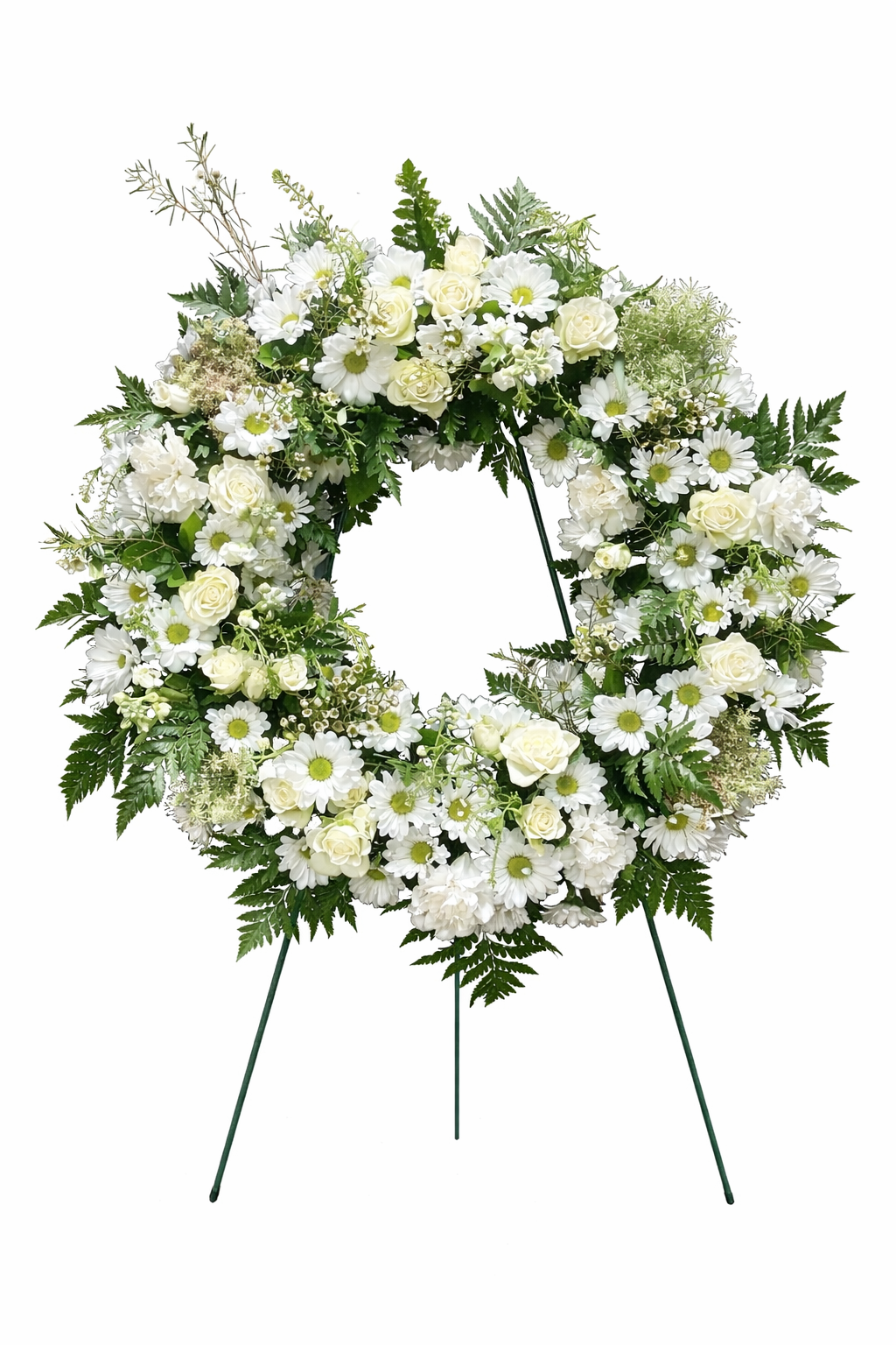 A graceful circle of remembrance crafted with delicate white blooms and fresh greenery. A timeless tribute honoring love, memory, and everlasting peace.