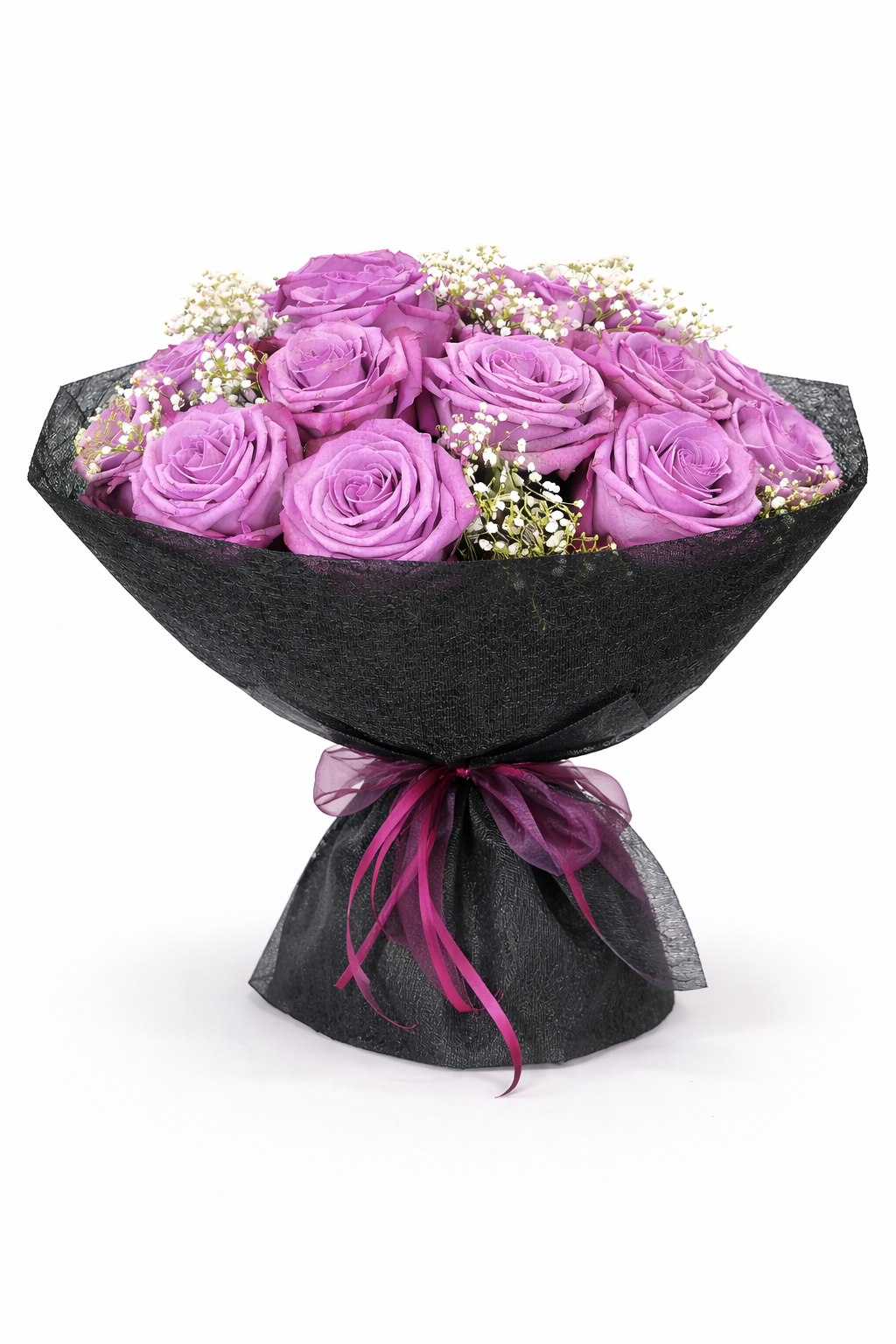 A lavish dome of premium lavender roses, artfully wrapped in textured black and finished with a sheer plum ribbon. Bold, refined, and undeniably captivating — designed to leave a lasting impression.