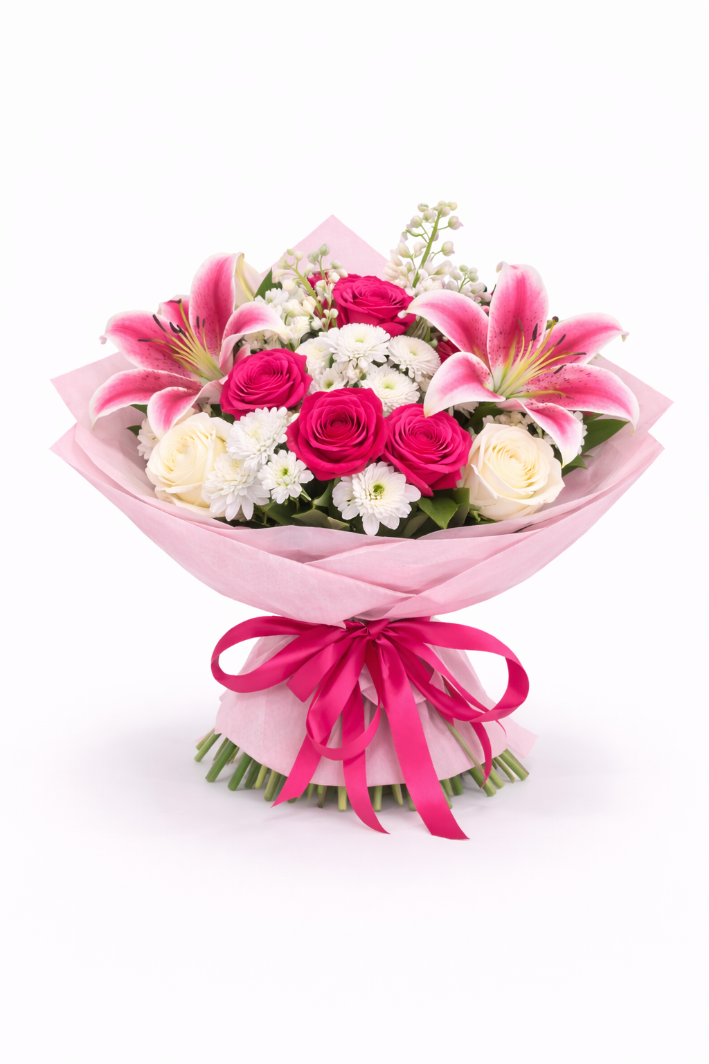 Elegant lilies combined with fresh roses and seasonal blooms create a luminous arrangement full of beauty and refinement.