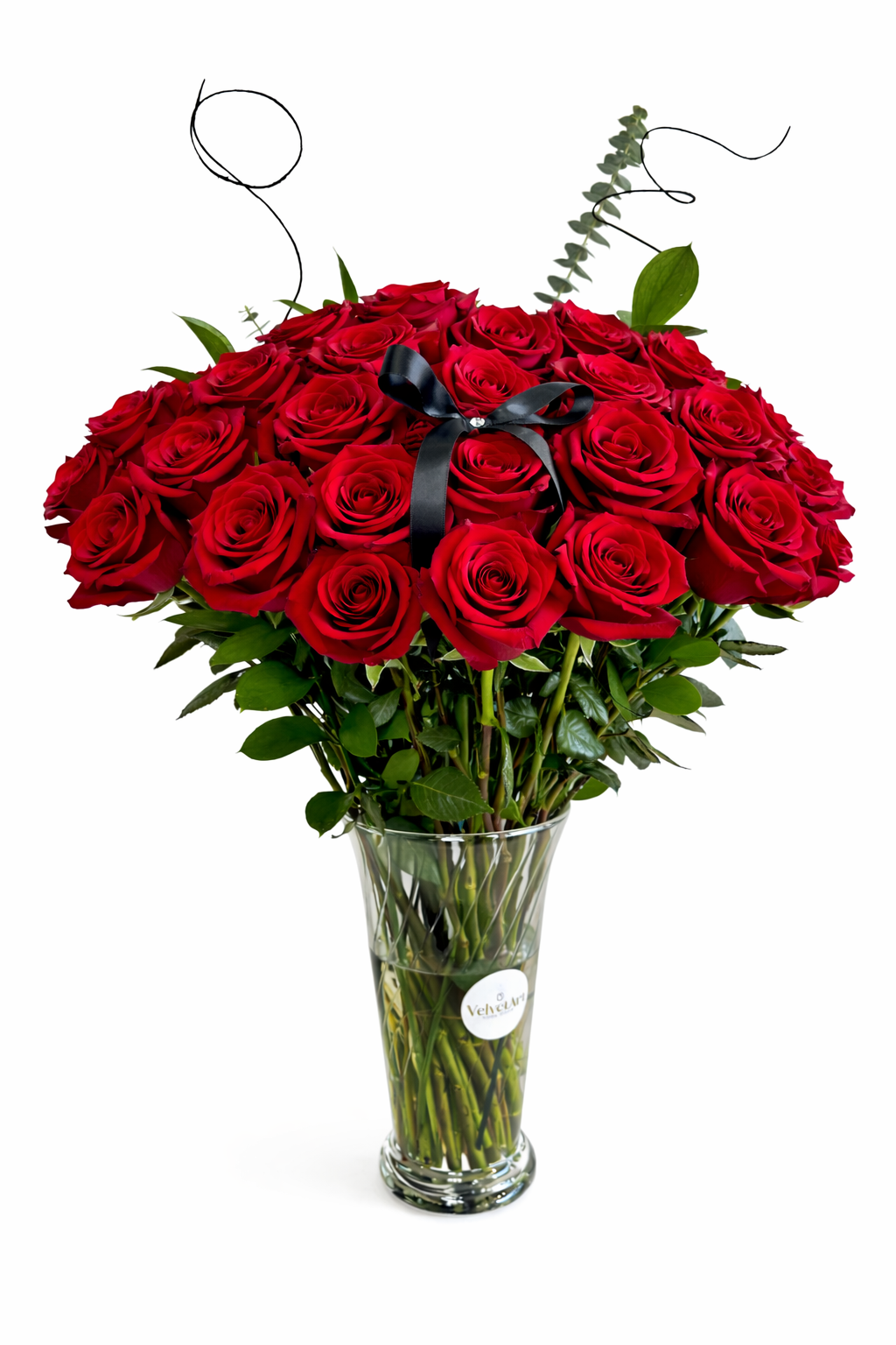 Premium: 24 stems, full luxury bouquet with eucalyptus.