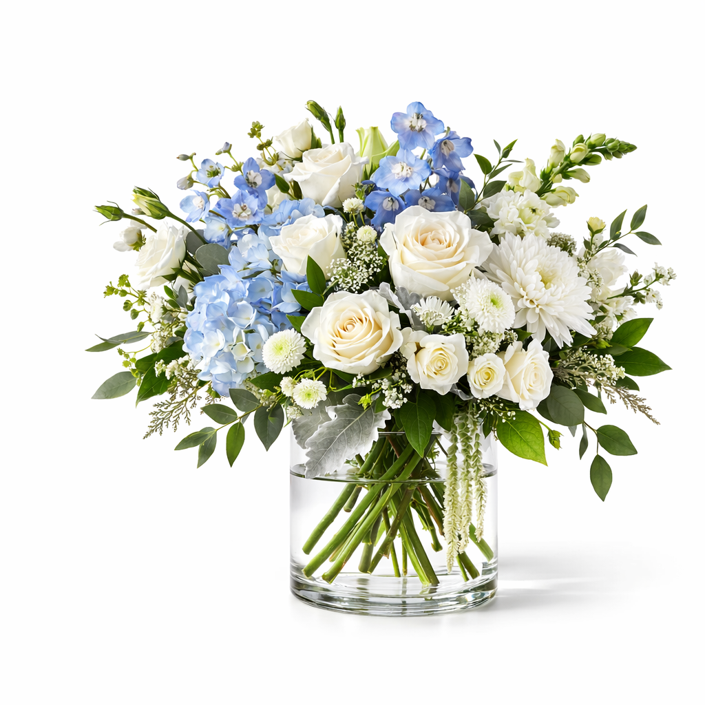 A serene interplay of ivory roses, airy blue hydrangea, and delicate delphinium in a crystal-clear cylinder vase. Fresh yet polished, Maggie captures quiet luxury with effortless grace.