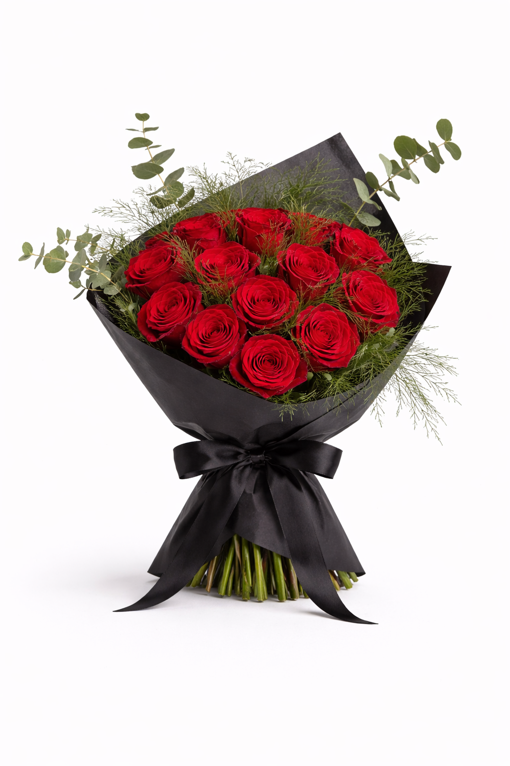 Premium: 24 stems, full luxury bouquet with eucalyptus.