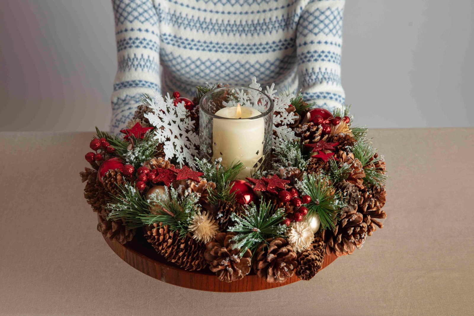 The Seasonal Candle Centerpiece blends the beauty of fresh flowers with the soft glow of candles for an unforgettable table setting. Designed with seasonal foliage, berries, and blooms, it creates an atmosphere of warmth and celebration.